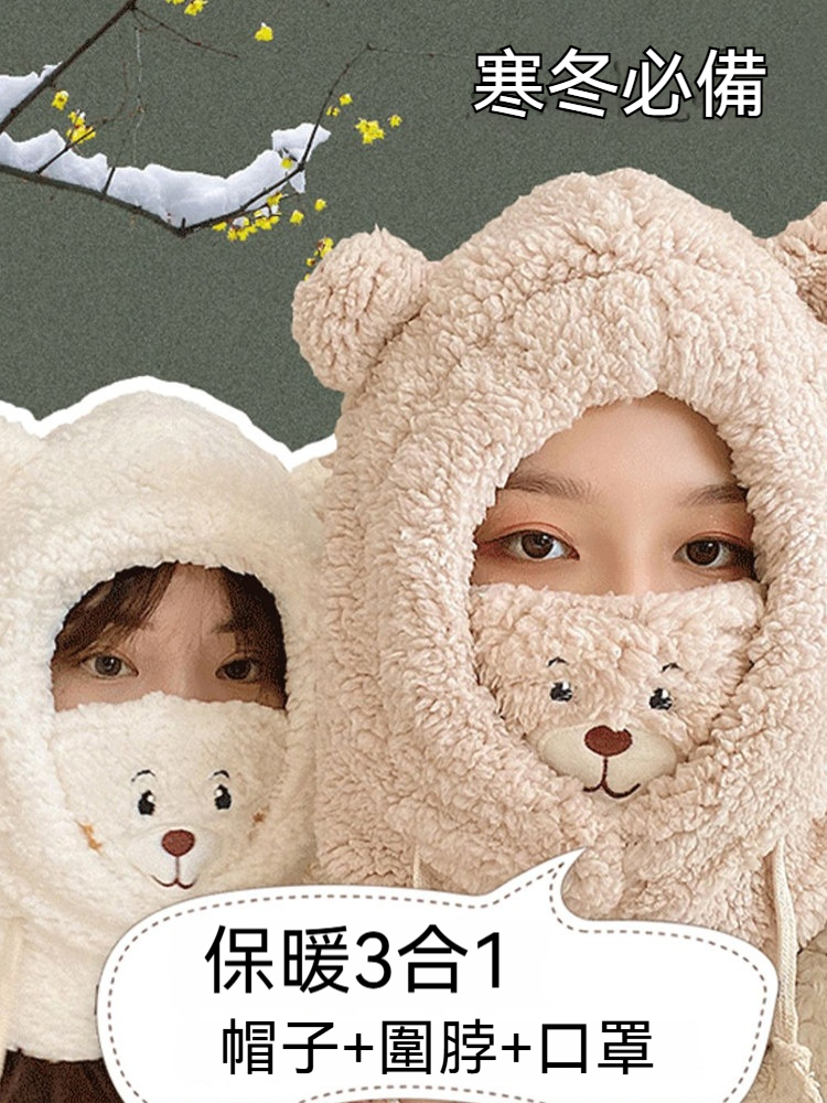 ✨小熊三合一毛絨帽|口罩×圍脖×護耳一秒戴整齊 ✅ 三合一無死角保暖 ✅ 加厚仿獺兔毛絨 ✅ 隱形透氣口罩層 ✅ 彈性百搭不挑臉型