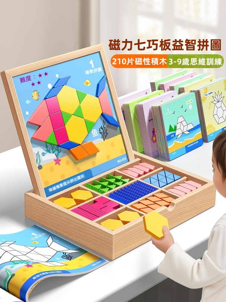 「磁力七巧板」木盒智慧寶藏|3歲玩到99歲的幾何魔法,吸附力滿分的腦力遊戲!✅ 磁性防滑設計 ✅ 原木安全材質 ✅ 雙面挑戰圖卡 ✅ 便攜鐵盒收納